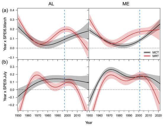 The impact of soil moisture on radial growth was not constant over time, as shown by the results of the GAMMs (Table 2). It is noteworthy that the higher R2m values found in ME than in the AL site indicating a higher explanatory power of the fixed factors. The effect of SPEI6.March initially diminished in both tree classes and sites until the 1970s–1980s, and later, the drought sensitivity of growth of MRTs exceeded that of MCTs. The impact of SPEI6.March on the MCTs’ growth increased steadily during the 21st century, but after mistletoe removal, this impact decreased and ceased increasing in MRTs from AL and ME sites, respectively (Figure 6a). The impact of SPEI9.July on BAI followed similar patterns at both sites. It increased in both MCTs and MRTs until the late 1990s and early 2000s, when it began to decline, although the decrease was more pronounced in MRTs (Figure 6b).