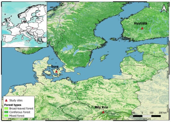 The study was conducted in three even-aged, previously managed European forest stands (Figure 1): (i) the Boreal Scots pine (Pinus sylvestris L.) forest of Hyytiälä, Finland (FI-Hyy); (ii) the wet temperate continental Norway spruce (Picea abies (L.) H. Karst) forest of Bílý Krìz in the Czech Republic (CZ-BK1); and (iii) the temperate oceanic European beech (Fagus sylvatica L.) forest of Sorø, Denmark (DK-Sor) where the 3D-CMCC-FEM (in different versions) has been already validated in the past [14,24,25]. An overview of the main site’s characteristics is presented in Table 1 and Table 2.