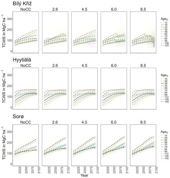 Under RCP 8.5, all classes show signs of decay at the end of the century. In the youngest aget0 classes, a sharp decrease in MAI was observed (from 8 to 4 m3 ha−1 year−1), while in the older ones, it holds steady to ~3 m3 ha−1 year−1 with a peak around 2075 (Figure 3). At FI-Hyy, younger aget0 classes (14- to 42-year-old) showed the fastest increase in TCWS (reaching 120–130 MgC ha−1 at the end of the century under all scenarios), also reflected in the pattern of MAI. Older aget0 classes showed a more stable trend throughout the simulation (Figure 2), culminating at ~150 MgC ha−1, with MAI steadily declining from 2.5 to 2 m3 ha−1 year−1. In all scenarios, the Scots pine peaked in the 126 and 56 aget0 in TCWS and MAI, respectively. Minor differences were found in mean TCWS between the NoCC and other RCP scenarios, ranging from −1.6% (140-year-old class under RCP 2.6) to +2.8% (14-year-old class under RCP 6.0). At DK-Sor, the results for TCWS show different patterns to other sites, with the highest values ranging between ~240 MgC ha−1 (under NoCC) and ~255 MgC ha−1 (under RCP 8.5) at the end of the century, with the least TCWS under NoCC. The younger classes showed a shallow increase in TCWS during the simulation period, stabilizing at the end of the century, while the older ones kept growing (Figure 4). DK-Sor was the only site where the tightening of the climate conditions caused a positive effect on the MAI, particularly in the younger classes, reversing the trend from negative to positive at the end of the century.