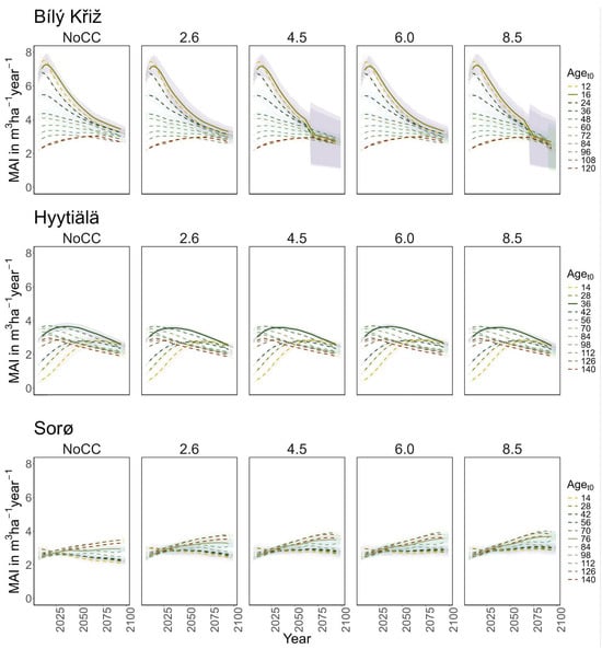 Modeled mean annual increment (MAI) (m3 ha−1 year−1) for age classes at the three sites in all scenarios along the simulation period (2006–2099). Lines represent the moving average of 10 years. The solid line corresponds to the real stand, while the dotted lines correspond to the virtual ones. The shaded area represents two standard deviations from the mean predictions with the results from the five ESMs climate change scenarios.