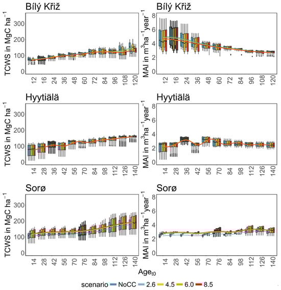 Boxplot of modeled total carbon woody stock (TCWS) (left, MgC ha−1) and mean annual increment (MAI) (right, m3 ha−1 year−1) for age classes at the three sites in the four RCPs scenarios compared to the NoCC (no climate change) scenario. Boxplots with thick borders correspond to the real stand. Lines are fitted throughout the median of the values of the variables using a generalized additive model.