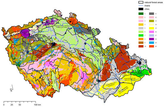 Map of the natural forest areas and geology of the Czech Republic 1: 500,000 (GeoČR500 Czech Geological Institute); 1 diorites and gabbros, Assyntian and Variscan; 2 Assynt granitoids (granites, granodiorites); 3 granodiorites to diorites (tonalite series); 4 uniform Moldanubica series (clast gneisses, paragneisses to migmatites); 5 Quarternary (silicate clastic sediments); 6 Mesozoic rocks (sandstone, claystone); 7 Alpine-folded Mesozoic rocks (sandstone, shale); 8 orthogneisses, granulites and very advanced migmatites in the Moldanubian and Proterozoic; 9 Paleozoic rocks folded and metamorphosed (phyllites, clasts); 10 Paleozoic rocks folded, not metamorphosed (shale, chert, quartzite, limestone); 11 Permian rocks (sandstone, conglomerate, claystone); 12 varied series of moldanubica (clast gneisses, paragneisses and migmatites with inclusions of limestone, erlane, quartzite, graphite and amphibolite); 13 Proterozoic rocks folded in Assynt, with varying degrees of Variscan metamorphism (schists, phyllites, clasts and pararules); 14 tertiary rocks (sands, clays); 15 Alpine folded Tertiary rocks (sandstone, shale); 16 dark granodiorites, syenites (durbachite series); 17 ultrabasite in the Moldanubian and Proterozoic; 18 Tertiary volcanic rocks (basalt, phonolites, tuffs); 19 partly metamorphosed volcanic rocks, Proterozoic to Paleozoic (amphibolites, diabases, melaphyres, porphyries); and 20 granites (granite series).