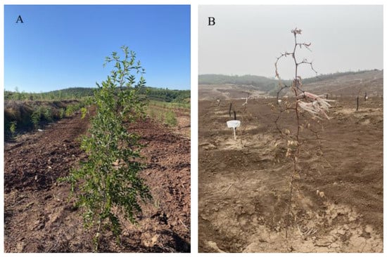 Growth status of experimental plants. (A) Images taken in August. (B) Images taken prior to sample collection.