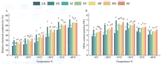Relative electrical conductivity and MDA content in branches of Ziziphus jujuba var. spinosa clones from different provenances under low-temperature treatments. (A) The REC of Z. jujuba var. spinosa branches from different provenances, (B). The MDA content of branches from the different provenances. Letters indicate comparisons between different clones at the same temperature (p < 0.05). LK: Kazuo, Liaoning; SX: Xiaxian, Shanxi; SJ: Jiaxian, Shaanxi; SY: Yanchuan, Shaanxi; HF: Fuxing, Heibei; HN: Neiqiu, Heibei; SC: Changqing, Shandong.
