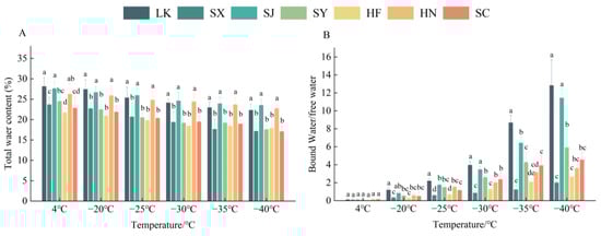 Water content in branches of Ziziphus jujuba var. spinosa clones from different provenances under low-temperature treatments. (A). The total water content of Z. jujuba var. spinosa clones from different provenances, (B). The BW/FW ratio in branches of each provenance. Letters indicate comparisons between different clones at the same temperature (p < 0.05). LK: Kazuo, Liaoning; SX: Xiaxian, Shanxi; SJ: Jiaxian, Shaanxi; SY: Yanchuan, Shaanxi; HF: Fuxing, Heibei; HN: Neiqiu, Heibei; SC: Changqing, Shandong.