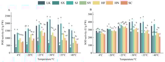 POD and SOD activity in branches of Ziziphus jujuba var. spinosa clones from different provenances under low-temperature treatments. (A). The POD activities of the branches of the five provenances, (B) The SOD activities of all five provenances. Letters indicate comparisons between different clones at the same temperature (p < 0.05). LK: Kazuo, Liaoning; SX: Xiaxian, Shanxi; SJ: Jiaxian, Shaanxi; SY: Yanchuan, Shaanxi; HF: Fuxing, Heibei; HN: Neiqiu, Heibei; SC: Changqing, Shandong.