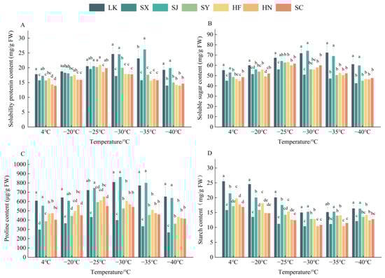 Osmotic regulation content in branches of Ziziphus jujuba var. spinosa clones from different provenances under low-temperature treatments. (A). The SP content of Z. jujuba var. spinosa branches from various provenances, (B). The SS content of the remaining five provenances, (C). The Pro content of Z. jujuba var. spinosa branches of the other five provenances, (D). The starch content of Z. jujuba var. spinosa clones from different provenances. Letters indicate comparisons between different clones at the same temperature (p < 0.05). LK: Kazuo, Liaoning; SX: Xiaxian, Shanxi; SJ: Jiaxian, Shaanxi; SY: Yanchuan, Shaanxi; HF: Fuxing, Heibei; HN: Neiqiu, Heibei; SC: Changqing, Shandong.