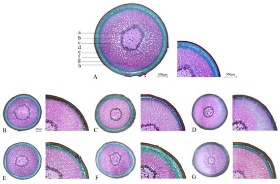 Anatomical structure indices of annual branches of Ziziphus jujuba var. spinosa clones from different provenances: (A) clone 89 (LK); (B) clone 531 (SX); (C) clone 614 (SJ); (D) clone 643 (SY); (E) clone 702 (HF); (F) clone 753 (HN); (G) clone 853 (SC). a: pith; b: vessel; c: xylem; d: pith ray; e: phloem; f: cortex; g: pericerp; h: epidermal.