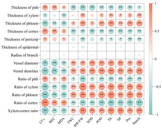 Correlation analysis of different physiological indices and anatomical structure. Red represents a positive correlation and blue represents a negative correlation. The size of the circle is proportional to the correlation coefficient. The following are the levels of significance: * p < 0.05; ** p < 0.01.