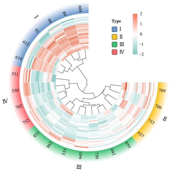 Systematic cluster analysis was performed using membership function values for each index of Z. jujuba var. spinosa clones. As shown in Figure 8, each clone was divided into four classes based on cold resistance. Cluster I had the highest average membership value (0.66) and included clones 89, 90, 91, 604, 612, and 614, which could be regarded as the clones with the greatest potential for low-temperature tolerance. Cluster II had an average membership value of 0.51, including clones 637, 706, 709, and 753. Cluster III had an average membership value of 0.38, including clones 535, 643, 645, 750, 752, 853, 859, and 862. Cluster IV had the lowest average membership value (0.34), including clones 530, 531, 702, and 752, indicating that it was more sensitive to low temperatures and demonstrated poor cold resistance.