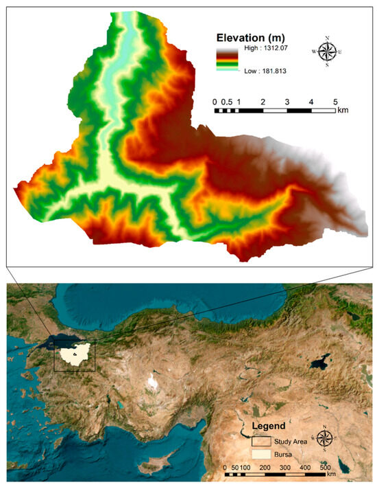 The Doğancı Dam Watershed, located on the Nilüfer Stream within the borders of the Osmangazi district of Bursa province in the Marmara Region, is located in the Susurluk Watershed, one of the 25 main river basins of Türkiye. The Doğancı Dam Watershed is located between 40°09′59.54″ and 40°04′08.00″ northern latitudes and 29°01′03.28″ and 29°05′21.48″ eastern longitudes (Figure 1). The construction of the dam, planned for a drinking water supply, was completed in 1983. The watershed covering 7559.99 ha extends in the north–southwest direction and its highest peak is Belen Hill with 1312.07 m. Based on the meteorological data obtained from the Osmangazi and Uludağ Meteorology Stations within the borders of the study area for the years 2000–2022, the average temperature is 15.3 °C and 5.2 °C, the average maximum temperature is 34.3 °C and 22.6 °C, and the average minimum temperature is −0.9 °C and −11.7 °C, respectively. The average monthly precipitation is 61.4 mm and 121.8 mm, while the total annual precipitation is 737.4 mm and 1461.6 mm, respectively (Table 1 and Table 2).