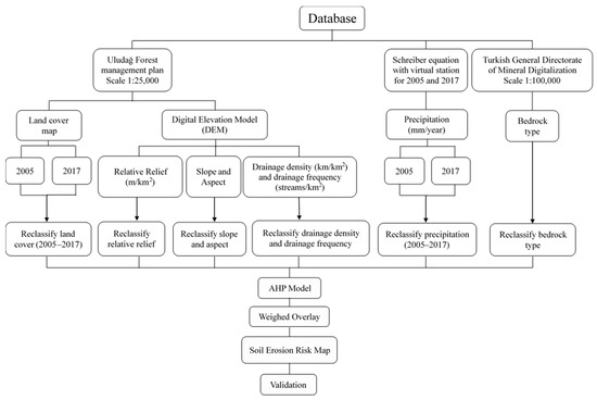 The erosion risk maps of the study area for the years 2005 and 2017 were produced using the GIS-integrated AHP method implemented in ArcGIS 10.8. The raster data layer with 10 m resolution was generated for each erosion factor. This method has three phases: erosion risk factors, AHP method, and erosion risk map and its validation. The flowchart of the methodology is indicated in Figure 2.