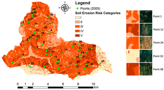 The results of the GIS-based AHP method revealed that approximately 36% of the study area had a high and very high erosion risk in 2005, while it reduced to approximately 32% in 2017 (Table 8). The total area with the medium erosion risk class reduced by 28.59% in 2017. On the other hand, the area of very low and low erosion risk classes both increased by 35.94% and 51.13%, respectively, in 2017. According to the land cover data of 2005, 38.53% of the total area was rehabilitation forests, while this rate was 5.26% in 2017. This decrease observed in rehabilitation forest areas in 2017 compared to 2005 was seen as an increase in low (from 5.18% to 14.13%) and medium closure (from 9.07% to 39.49%) forest areas. Thus, it was found that overall forest areas (FC, MC, LC) in the study area increased by slightly over two times (119%) in a 12-year period. When the activities of the Bursa, Çalı, and Soğukpınar Forest Enterprise Chiefs in the 2005 and 2017 plan periods were evaluated, the maintenance, regeneration, conversion of coppice forest, and rehabilitation works carried out on a total area of 1345.1 ha can be shown as the reason for this improvement. In a similar study, the percentage of soil loss in degraded forests and shrubs was estimated to be approximately 70 times higher than in high-closure Scots pine forests in the city of Erzurum in Türkiye [118].