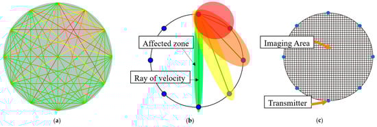 Among existing stress wave imaging algorithms, an algorithm called ellipse-based spatial interpolation (EBSI for short) can achieve relatively good 2D imaging results of internal defects in wood using stress wave signals and has become a classic algorithm in wood defects detection field [21,22,23]. The propagation mechanism of stress waves in wood has not been fully understood, because wood is an anisotropic material with a special internal structure [24,25,26]. Against this background, the EBSI method assumes that the propagation path of the stress wave in wood is a straight line, visualizes the stress wave propagation velocity matrix as shown in Figure 1a, and then reconstructs the internal defects using spatial interpolation. In order to distinguish the defective area from the healthy wood area, the stress wave velocity can be visualized in different colors [27,28]. The greater the wave velocity, the greener the color corresponding to the straight line, which means that the stress wave has passed through the healthy area; On the contrary, the smaller the wave velocity value, the redder the color corresponding to the straight line, which means that the stress wave has passed through the defect area (if it encounters a cavity defect, the stress wave will propagate around the defect area, resulting in an increase in the propagation time between two sensors). As shown in Figure 1b, the basic idea of the EBSI method is to ellipticize each stress wave propagation straight line and estimate each grid point in the imaging area (as shown in Figure 1c) using elliptic space interpolation. Specifically, an ellipse is generated adaptively according to the length of the propagation straight line (which becomes the affected zone), and then the velocity distribution value of each grid point in the imaging area is traversed and calculated by the colors of all ellipses covering the grid point. Different interpolation strategies such as ellipse shape design and grid point estimation have been proposed based on EBSI [20,22,23,29,30,31].