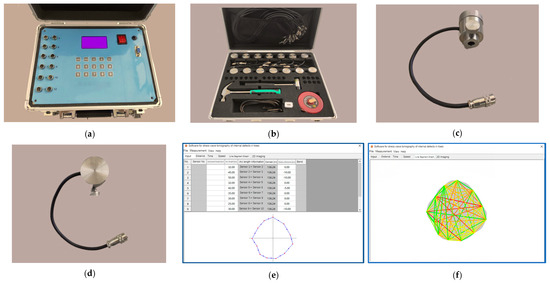 Self-developed apparatus: (a) signal processing box; (b) toolbox; (c) sensor (angle 1); (d) sensor (angle 2); (e) self-developed software (interface 1); (f) self-developed software (interface 2).
