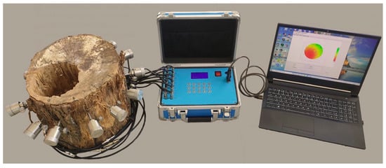 Wood is an important biological resource and material. How to effectively detect the internal defects of wood without destroying wood is meaningful research, which can help protect trees and ancient wooden buildings and improve the utilization rate of logs [1,2]. At present, researchers in this field widely use stress wave signals to analyze and assess internal defects in wood [3,4,5]. Stress wave technology has the advantages of good portability, slight damage to wood, strong anti-interference ability, no harm to the human body, and convenience of use [6]. It reflects the internal structural characteristics of the tested object through the difference in stress wave propagation velocity in different media [7,8]. In the application of this technology, a sensor placed in a certain position on the cross-section of the tree trunk is used to generate stress wave signals, and the other stress wave sensors placed annularly on the cross-section of the tree trunk are used to receive stress wave signals propagating in different directions inside wood. Then, by analyzing the time difference between the received signal and the excitation signal, the propagation velocity distribution matrix of the stress wave is established. Finally, according to the difference in stress wave propagation velocity in different media (internal defects and healthy wood), pattern recognition can be used to assess the internal health of wood [9,10,11]. Furthermore, stress wave imaging methods such as spatial interpolation can be used to reconstruct the image of wood internal defects, so as to intuitively reflect the location, size, and shape of the defects [12,13,14].