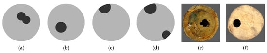 Simulation samples and tree trunks: (a) overlapping double circle; (b) single circle distribution; (c) edge semi-circle; (d) double edge semi-circle; (e) Pecan tree trunk with cavity; (f) Camphor tree trunk with cavity.