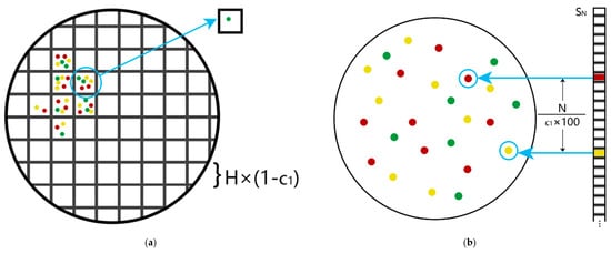 When c1 < 0, the number of corresponding sensors is 10–12. At this time, the number of sensors, paths, and intersections is relatively sufficient, and some basic feature points can be appropriately deleted. The deletion strategy is shown in Figure 6a, with H × (1 − c1) as the window width and H as the image height of the imaging area. In each deletion window, only the grid points with the highest wave velocity value in the window are reserved. Obviously, if the color of the retained grid points is still red, it shows that the window is most likely located in the defect area, and this strategy is helpful in restoring the spatial distribution of defects.