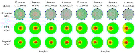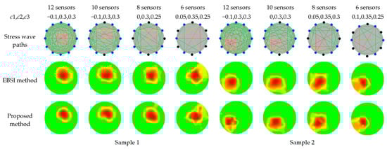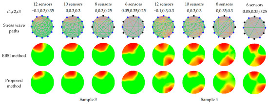 - With the decrease in the number of sensors and stress wave signals, the imaging effect of the EBSI algorithm and the algorithm proposed in this paper will become worse. However, regardless of the number of sensors, for all samples, compared with the traditional EBSI method, the defect area reconstructed by the proposed method is closer to the actual defect area, and the defect contour reconstructed by the proposed method is also more similar to the actual defect contour.
