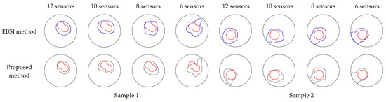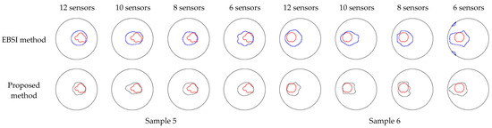 The above comparative experimental results show that the imaging effect of the proposed algorithm is better than that of the EBSI algorithm for all given samples. Especially when the number of sensors is reduced to six, the EBSI imaging results of samples No. 1, No. 2, No. 4, and No. 6 are greatly different from the real defects, which shows that the EBSI method can not guarantee imaging accuracy under sparse signals. The proposed algorithm benefits from the intervention of compressive sensing theory and can maintain a good imaging effect under sparse signals.