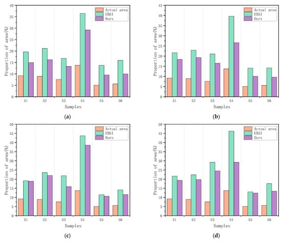 Comparison of area proportion of reconstructed defects with different numbers of sensors: (a) 12 sensors; (b) 10 sensors; (c) 8 sensors; (d) 6 sensors.