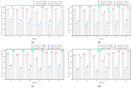 Comparison of accuracy, precision, and recall with different numbers of sensors: (a) 12 sensors; (b) 10 sensors; (c) 8 sensors; (d) 6 sensors.