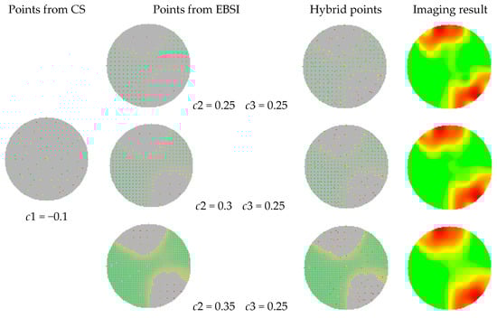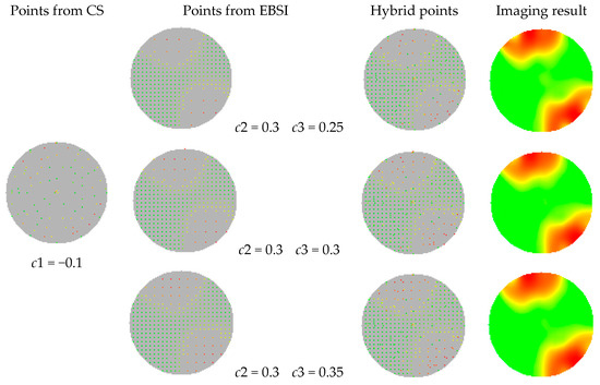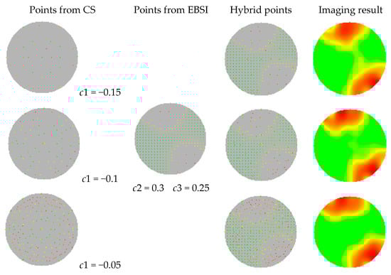 In order to achieve a relatively balanced number of two types of feature points, a large number of grid points need to be removed from the imaging results of the EBSI algorithm. Therefore, the feature point control parameter c2 = 0.3 is temporarily fixed. In addition, in order to leverage the ability of EBSI to reconstruct healthy areas, the feature points control parameter c3 = 0.25 is temporarily fixed. When there are 12 sensors, the impact of parameter c1 on the imaging process of sample 4 is shown in Figure 16. The first column visualizes the feature points extracted from the compressed sensing imaging results (controlled by parameter c1). The second column visualizes the feature points extracted from the imaging results of the EBSI algorithm (controlled by parameters c2 and c3). The third column shows the visualization results of two types of feature points mixed together. The experimental results show that as the parameter c1 increases, the number of feature points extracted from compressed sensing imaging results continuously increases, and the best hybrid imaging result appears when c1 = −0.1.