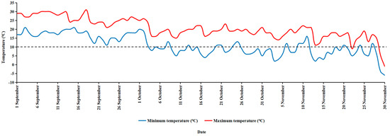 The Z. schneideriana seeds were collected from the same provenance and planted in the forest farmland. The maximum and minimum daily temperatures were recorded during the discoloration period in 2023 (Figure 1). The leaves were harvested from the five-year-old plants on 15 September (green period) and 30 November (discoloration period) for physiological index test and pigment content measurement. The total RNA was also extracted for transcriptome sequencing and gene expression analysis.