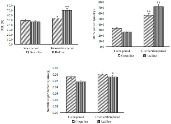 Physiological measurements showed that the REL value, MDA content, and soluble sugar content were similar in the green lines and red lines in the green period but varied greatly in the discoloration period (Figure 3). Among them, the increase in the REL value in the red lines was 1.51 times higher than that in the green period, while it remained unchanged in the green lines. The MDA content increased significantly in both lines in the discoloration period; it was 2.02 times and 1.76 times higher than in the green period in red and green lines, respectively. The soluble sugar content in the green lines did not change significantly in the discoloration period but it was slightly higher in the red lines; it was 1.15 times higher in the discoloration period than in the green period. These results indicated that the REL value and MDA content in the red lines in the discoloration period were 1.18 times and 1.24 times more than those in the green line, respectively, while the soluble sugar content was 92.11% of that of the green lines. All the data revealed that the Zelkova plants declined with a decrease in temperature, and the red lines decreased more than the green lines.