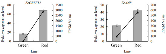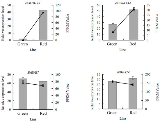 Six genes were randomly selected for the RT-PCR test. The expression of ZeRVE7 in the green line in the discoloration period was 1.10 times higher than that in the red line, whereas the expression of ZeMYB113, ZeWRKY44, ZeBBX24, ZeGSTF12, and ZeANS in the red line was 27.27, 1.93, 1.12, 4.20, and 1.95 times higher than that in the green line, respectively. The test results matched the transcriptome data (Figure 4), which suggested that the sequencing data might be used to determine the differentially expressed genes (DEGs) of the red and green lines.