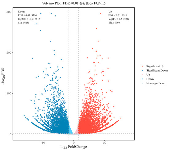 In total, 13,245 differentially expressed transcripts (Figure 5) were identified in the red and green Zelkova lines during the discoloration period using DESeq2. Among them, 6960 transcripts were upregulated and 6285 transcripts were downregulated in the red lines compared to in the green lines.