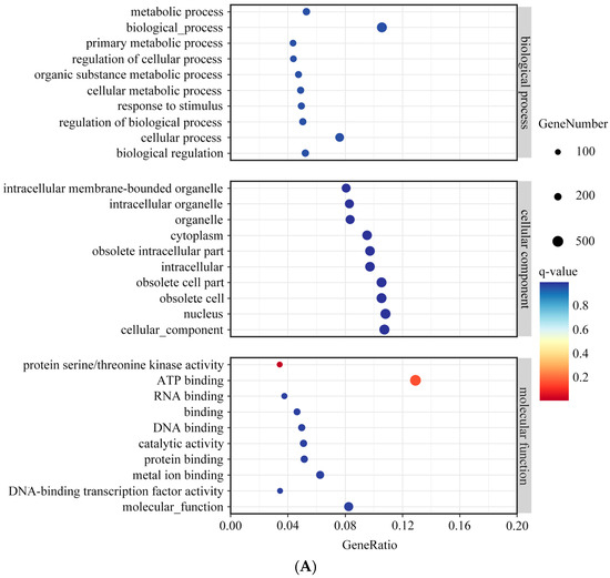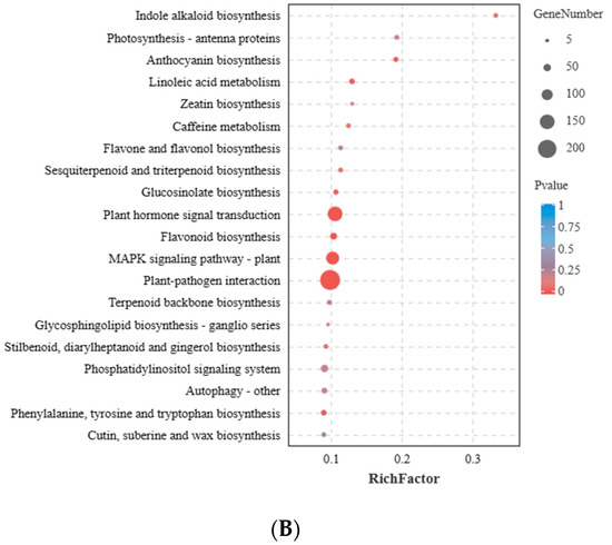 According to the Swissport software, 13,245 differentially expressed transcripts were anchored to 3965 genes. GO annotation classified these genes into three categories. In biological processes, the DEGs were mainly enriched in items related to cellular processes (302 genes) and metabolic processes (210 genes). In cell components, the DEGs were mainly enriched in the sections associated with the nucleus (429 genes) and obsolete cells (418 genes). In molecular functions, the DEGs were mainly enriched in the items related to ATP binding (512 genes) and metal ion binding (248 genes) (Figure 6A). The results of the KEGG analysis showed that the DEGs were mainly enriched in the pathways of plant–pathogen interaction (193 genes), the MAPK signaling pathway (110 genes), plant hormone signal transduction (129 genes), flavonoid biosynthesis (32 genes), and anthocyanin biosynthesis (five genes) (Figure 6B). These genes and pathways were, therefore, involved in the discoloration of the Zelkova lines.