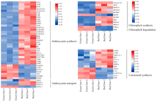 DEGs between red and green lines in relation to pigment metabolism. The red blocks indicate high expression levels in plants, and the blue blocks represent lower expression levels.