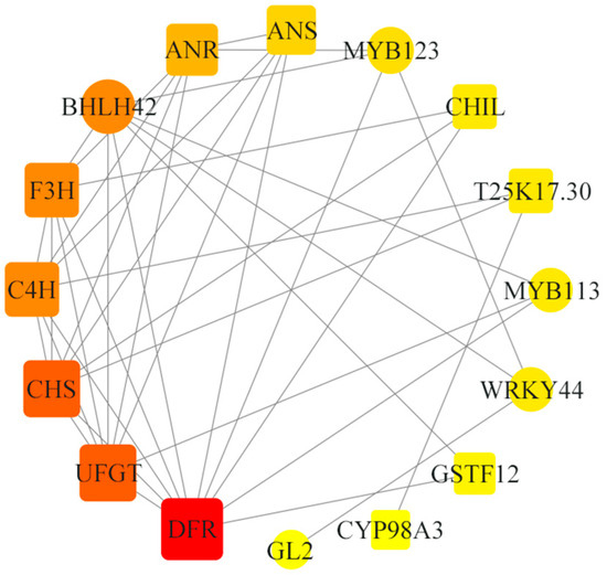 Association analysis of the anthocyanin genes with the transcription factor genes differentially expressed in red and green lines in the discoloration period. The square blocks indicate anthocyanins synthesis genes. The circle blocks indicate the transcription factors. The lines indicate the interaction between two genes.
