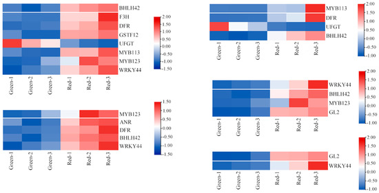 An interaction network was constructed between the transcription factors and anthocyanin synthesis genes differentially expressed in the red and green lines using the STRING database (https://cn.string-db.org/, accessed on 23 August 2023). The network included 11 anthocyanin synthesis genes and five transcription factors (Figure 8). Among them, ZeBHLH42 regulated four anthocyanin synthesis genes and three transcription factors. The other transcription factors, including ZeMYB123, ZeMYB113, ZeWRKY44, and GL2, regulated four, three, three, and one gene, respectively. They mostly upregulated the expression of the target genes, except for the UFGT gene. These five transcription factors were expressed to a higher degree in the red lines than in the green lines by 5.90, 7.13, 298.91, 5.67, and 3.94 times, respectively (Figure 9). They were involved in anthocyanin synthesis and participated in the discoloration of the red lines.