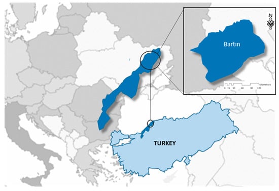 This research was conducted in Bartın Province (Figure 1). Bartın is in the Western Black Sea Region and is one of the regions with the richest forest cover in Turkey. The climate and geological structure in the region offer favorable conditions for the growth of laurel species. Summers are generally hot, and winters are mild. In 2023, the average temperature in the region was 25 °C, with a high of 41 °C in July and a low of −24 °C in January. The annual rainfall in the region is 393 mm [85].