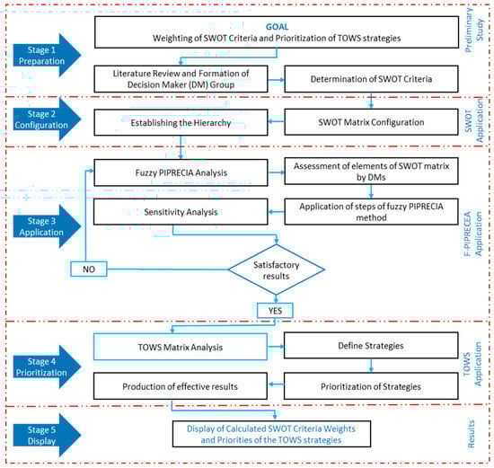 The overall procedure of this study consisted of five stages. DMs select the best alternative under many criteria. MCDM techniques have been developed using iterative numerical techniques to assist the DM [87]. Evaluation criteria often try to achieve conflicting objectives simultaneously. On the other hand, many hybrid methods such as F PIPRECIA-TOPSIS, F-PIPRECIA-VIKOR, F-PIPRECIA-COPRAS, F-PIPRECIA-PROMETHEE, and F-PIPRECIA-MOORA are suitable to be used together [88,89,90].