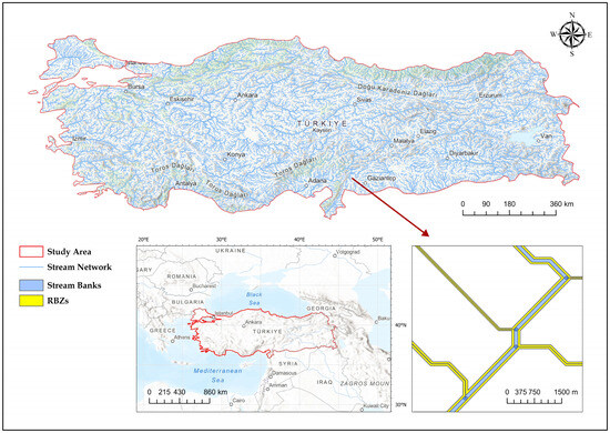 Within the scope of this study, the region of interest includes all perennial, intermittent, and ephemeral streams within the administrative boundaries of the Republic of Türkiye, with a total length of 39,348 km (Figure 1). This comprehensive inclusion of stream types ensures a thorough analysis of RBZs under different hydrological conditions within the country. It is important to note that larger water bodies like lakes, reservoirs, and dams are excluded from this study’s focus on stream networks.