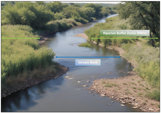 RBZs are the land and plant communities adjacent to rivers, streams, bays, and other water bodies (Figure 2). These areas are characterized by high soil moisture and are prone to erosion, underscoring the need for their proper management. The width of these buffer zones and their vegetation types are critical initial decisions in their management. Historical studies, including one conducted in Australia in 1881, found that buffer zones with a grass width of 5 m and tree cover of up to 30 m effectively prevented erosion and the subsurface movement of nutrients [49]. Following these early findings, the effectiveness of various widths and vegetation strategies in preventing erosion within RBZs has been extensively studied over time [50,51,52,53,54].