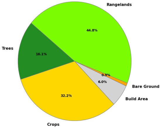 The current status and temporal land cover changes within the designated RBZs were assessed using Esri Sentinel global land cover maps produced annually between 2017 and 2023. The area, measured in hectares, covered annually by eight of the nine different land cover classes within the RBZs, is detailed in Table 2. In addition, Figure 3 illustrates the average percentage coverage of dominant land cover classes over the seven years. The analysis shows that ‘Rangelands’ is the predominant land cover within the RBZs, consistently covering over 500,000 hectares. On average, the ‘Rangelands’ class accounts for 44.8 percent of RBZs, followed by ‘Crops’ at 32.2 percent and ‘Trees’ at 16.1 percent. In addition, it has been determined that total green areas, excluding agricultural fields, cover approximately 61 percent of the entire RBZs. The ‘Built Area’ class accounts for an average of 6 percent of RBZs, varying between 62,000 and 76,000 hectares over the years. The least common class is ‘Bare Ground’, besides the classes ‘Flooded Vegetation’ ‘Snow-Ice’, and ‘Clouds’, which are not included in Figure 3 due to their negligible representation.