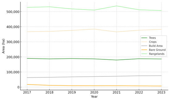 The line graph illustrates the area (ha) trend of different land cover classes from 2017 to 2023.