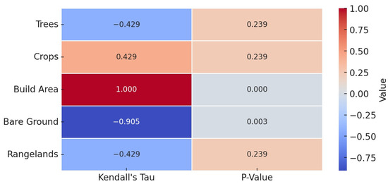 The heatmap summarizes each land cover class’s Mann–Kendall trend test results, displaying Kendall’s tau (trend coefficient) and p-values.