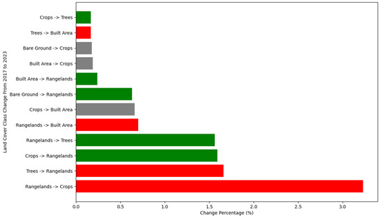 Bar graph depicting percentage shifting between land cover classes within RBZs from 2017 to 2023. Green bars indicate transitions beneficial to water quality, such as increases in vegetation cover, while red bars represent shifts detrimental to water quality, such as increases in built-up areas or agricultural expansion. Gray bars denote neutral changes or show no significant impact on ecological health.
