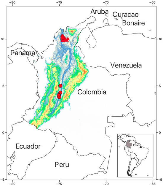 Geographic location of the study area along the Magdalena River basin. The red-filled circles represent the monitored sites within the inter-Andean valleys, and the red-filled triangles indicate the monitored sites in the Caribbean plains.