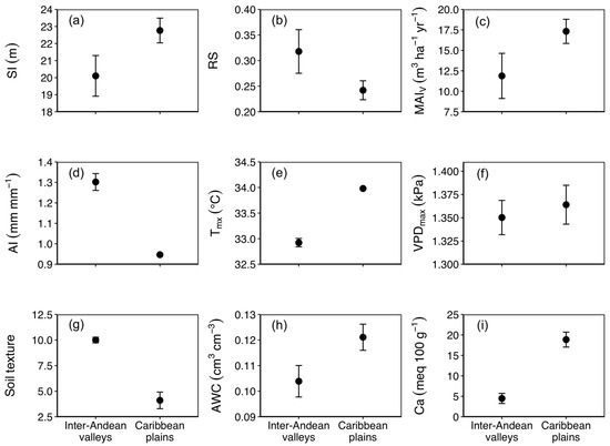 Means and 95% confidence intervals for stand, climate, and soil variables for G. arborea stands in the inter-Andean valleys and the Caribbean plains. Site index (a), relative spacing (b), mean annual increment in volume (c), aridity index (d), maximum air temperature (e), maximum vapor pressure deficit (f), soil texture (g), soil available water capacity (h) and soil calcium content (i).