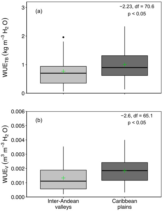 Variation in WUE in total biomass (a) and total volume (b) for G. arborea stands grown in the inter-Andean valleys and Caribbean plains of the Magdalena River basin, Colombia. Green plus sign represents the mean.