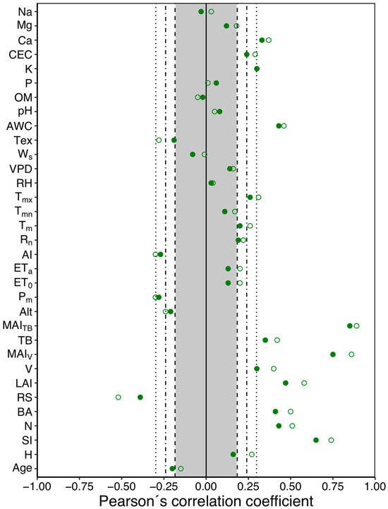Pearson correlation coefficients (r) and statistical significance for WUETB (solid green circles) and WUEV (empty green circles) and stand and site (climate and soil) variables. Correlation coefficients beyond the dotted lines are highly significant (p < 0.001); those between the dotted lines and the dot-dash lines are significant (p < 0.01); those between the dot-dash lines and the dashed lines are significant (p < 0.05); the gray area is not significant (p > 0.05).
