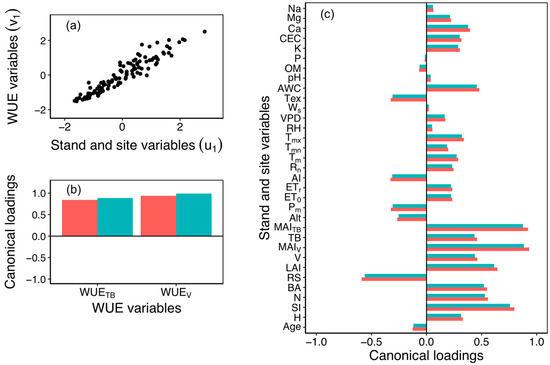 Figure 5b shows the canonical loadings between the canonical variable v1 (cyan) and each of the observed variables composing it, WUETB (canonical loading of 0.89) and WUEV (canonical loading of 0.99). As can be seen in Figure 5b, there is a high correspondence between the values of the canonical variables, as the canonical cross-loadings between u1 (red) and WUETB and WUEV also show high values of 0.84 and 0.94, respectively. Figure 5c shows the canonical loadings (red) and cross-loadings (cyan) of each of the 33 observed stand and site variables as well as the canonical variables formed by the stand and site variables (u1 = red) and water use efficiency (v1 = cyan).