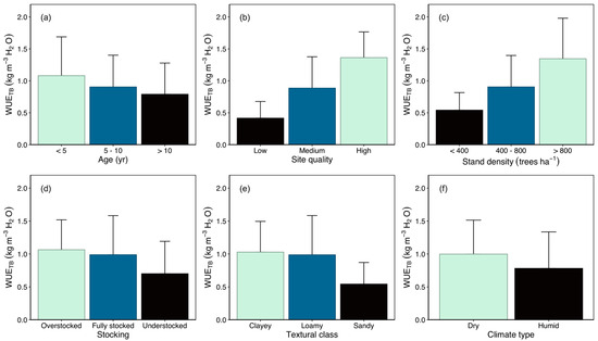 Factors influencing water use efficiency of G. arborea forest stands. Effects of age (a), site quality (b), stand density (c), stocking levels derived from RS classes (d), soil textural class (e), and climate type derived from AI (f). The error bars represent the standard deviation.