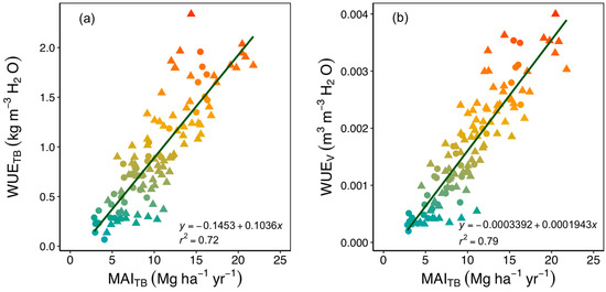 Figure 7 illustrates the relationship between the MAITB and WUEV and WUETB. Circles represent PSPs in the inter-Andean valleys, and triangles represent PSPs in the Caribbean plains. Figure 7a shows a positive correlation between MAITB and WUETB (kg m−3 H2O), with a coefficient of determination of 0.72. Similarly, Figure 7b shows a positive correlation between MAITB and WUEV (m3 m−3 H2O), with a coefficient of determination of 0.79, indicating that higher MAITB is associated with greater WUEV. These results suggest that in both the inter-Andean valleys and the Caribbean plains, higher MAITB is positively correlated with greater WUE, both in terms of total biomass and volume.